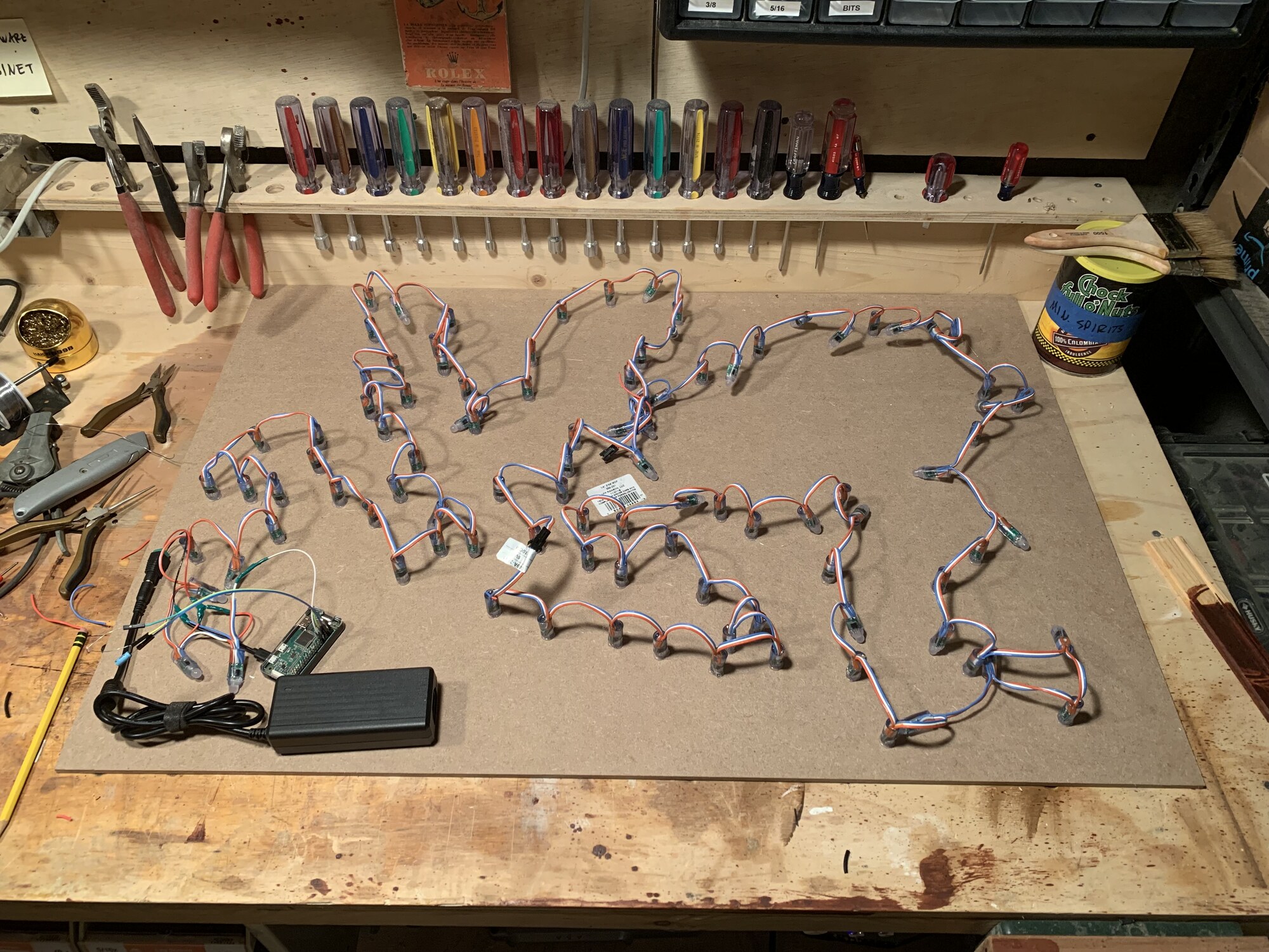 I have built two 24x36” maps that display airport weather conditions using individually-addressable LEDs. They are powered by Raspberry Pi Zero W’s running a custom Elixir Nerves application.