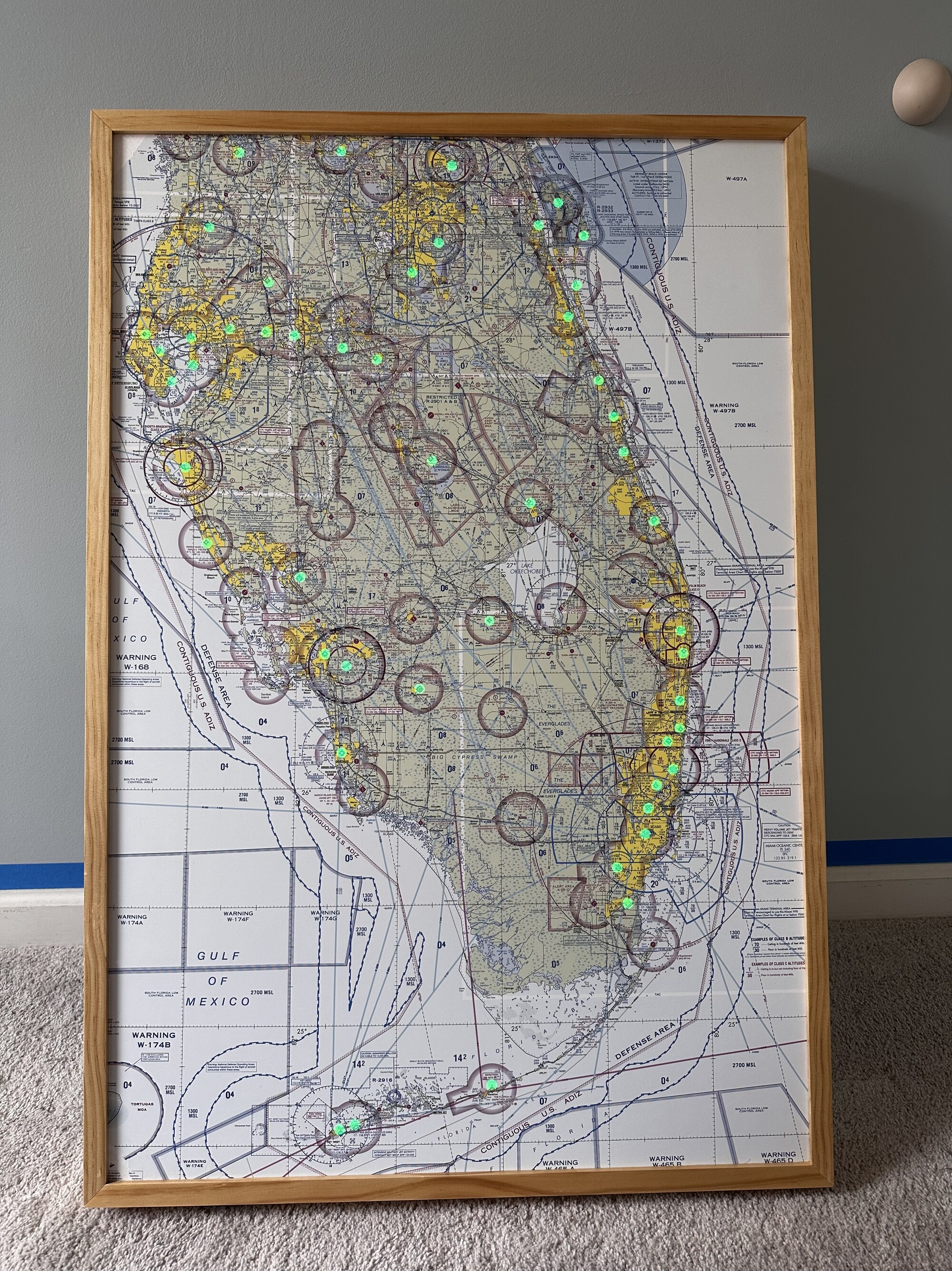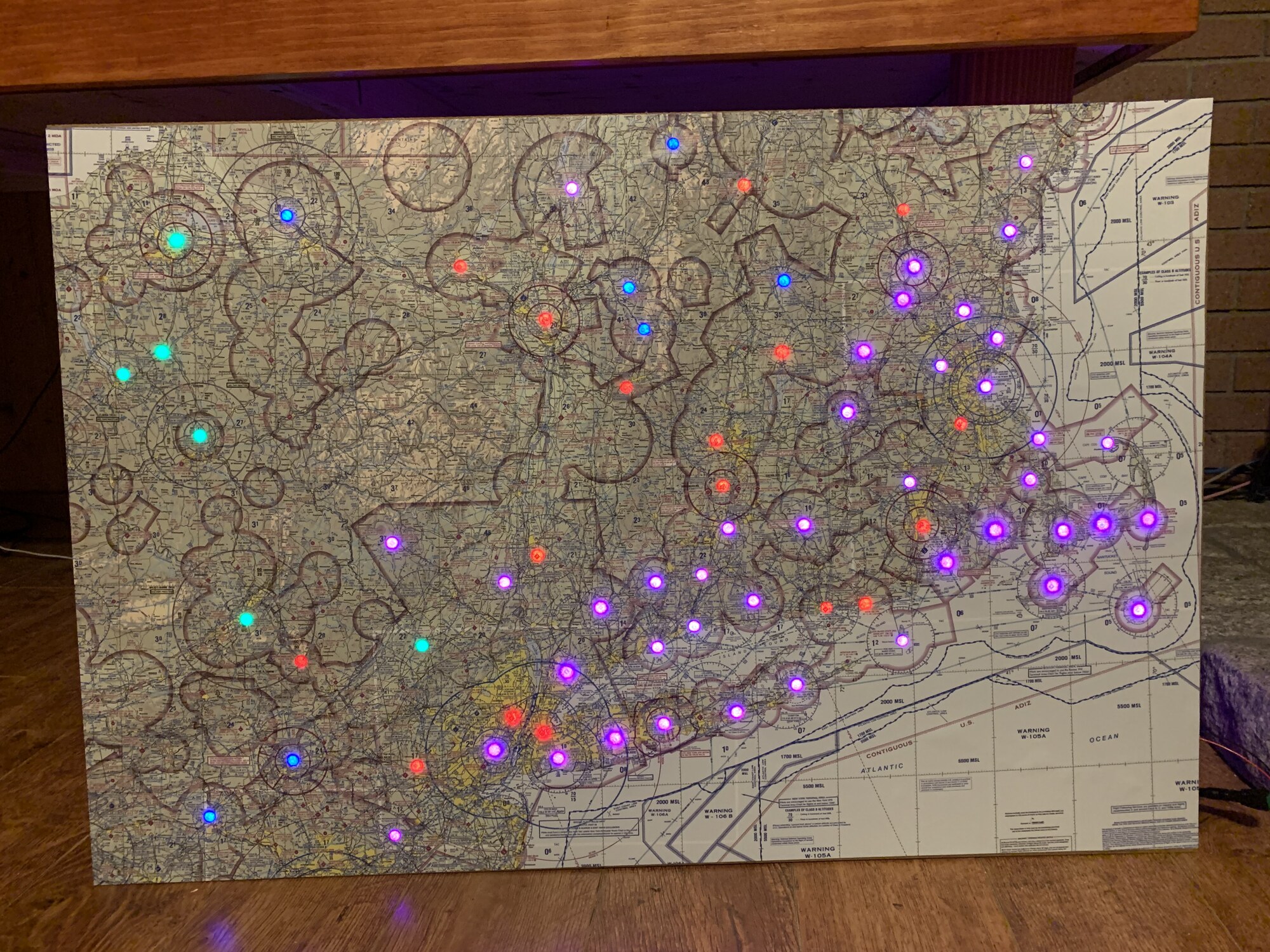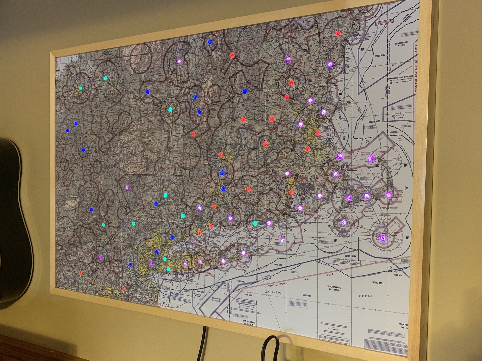 I have built two 24x36” maps that display airport weather conditions using individually-addressable LEDs. They are powered by Raspberry Pi Zero W’s running a custom Elixir Nerves application.